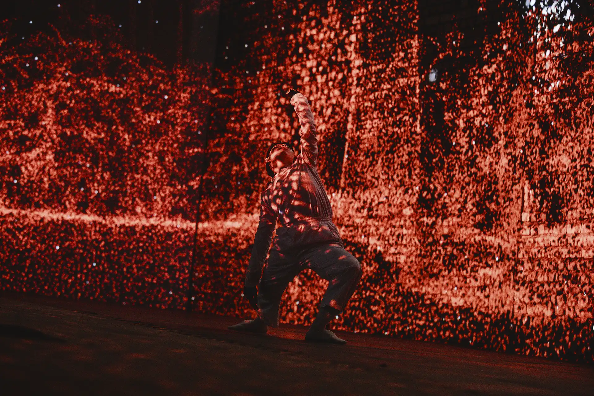With a performance combining dance, video, lasers, and electronic music by the German composer Jonas Margraf, \a.ni.i.la.sjɔ̃\ (Annihilation) transports its audience into a realm where the complex interplay between humanity, industrial activities, and the natural world takes center stage. As the dancer fluidly navigates the stage, his movements become an eloquent language, expressing a radical dystopian vision where the inexorable march of technological progress threatens to usher in an era of irreversible decline. The fusion of human gestures and striking images creates a haunting tapestry, vividly depicting a world where the boundaries between progress and peril are blurring with spine-chilling intensity.