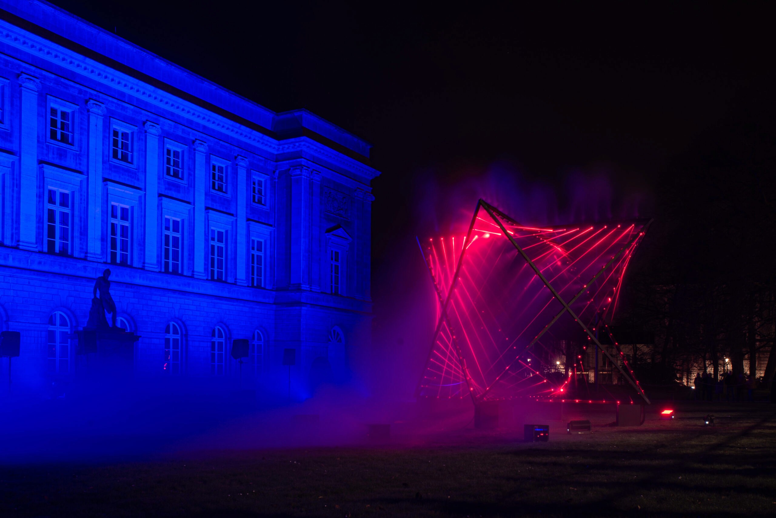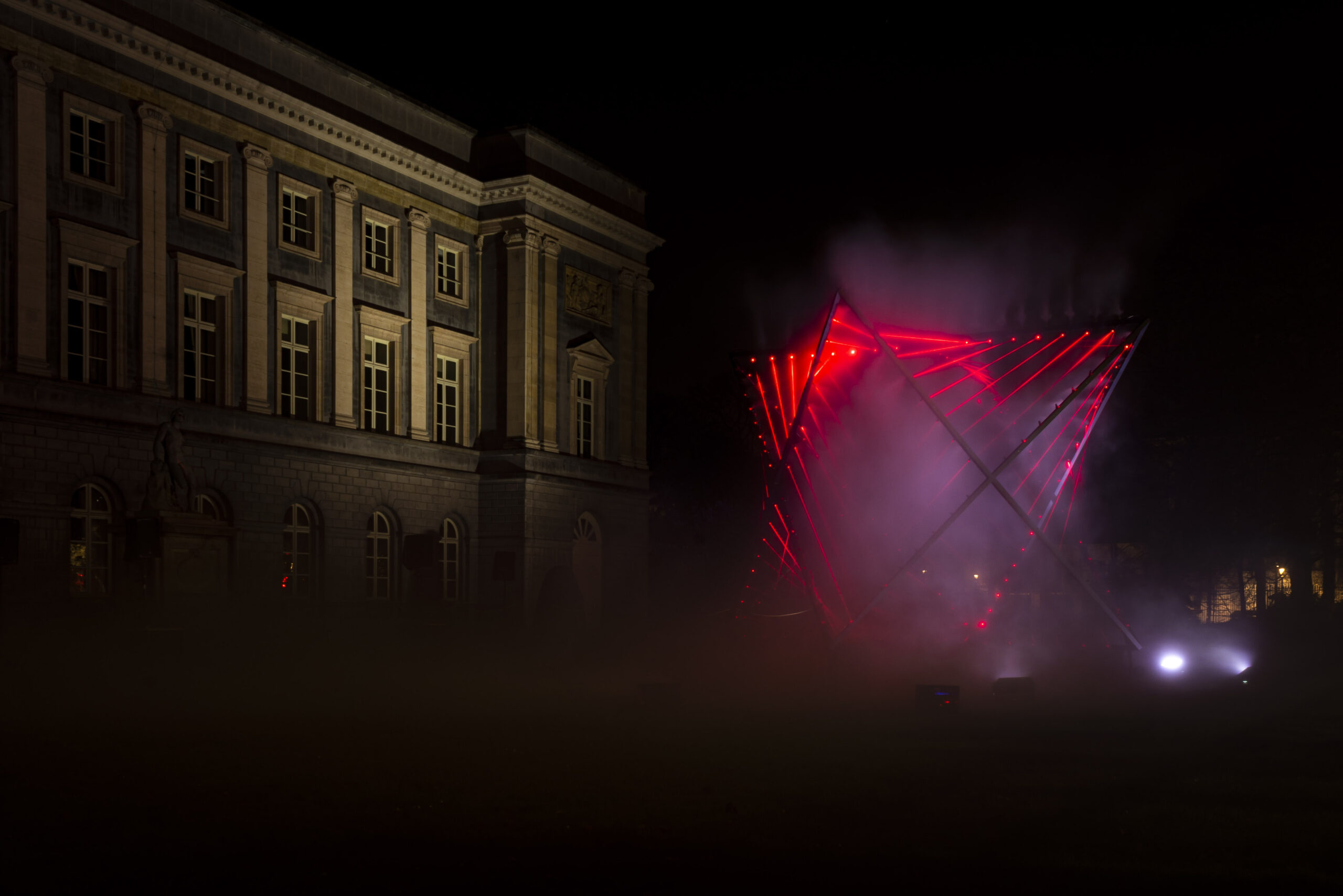 Building on Xenakis’s legacy, Hyperform reinterprets these principles, creating a dynamic structure composed of twelve hyperbolic paraboloids drawn entirely with light. The animated laser sculpture explores the interplay of straight lines and curves though each laser beam is a straight line, their arrangement generates an illusion of organic, curved surfaces. As the sculpture illuminates, it manipulates perception, offering a spatial and visual experience that evolves depending on the viewer’s position.